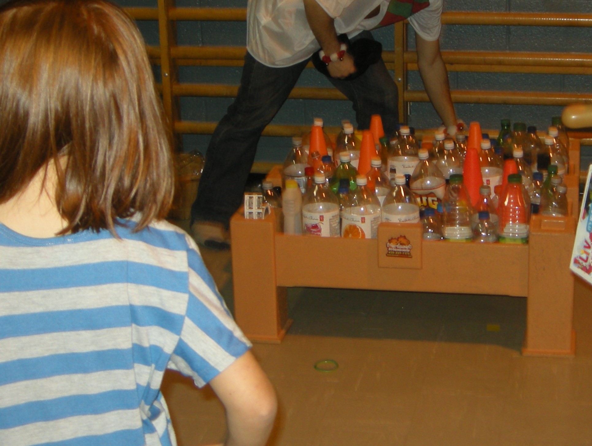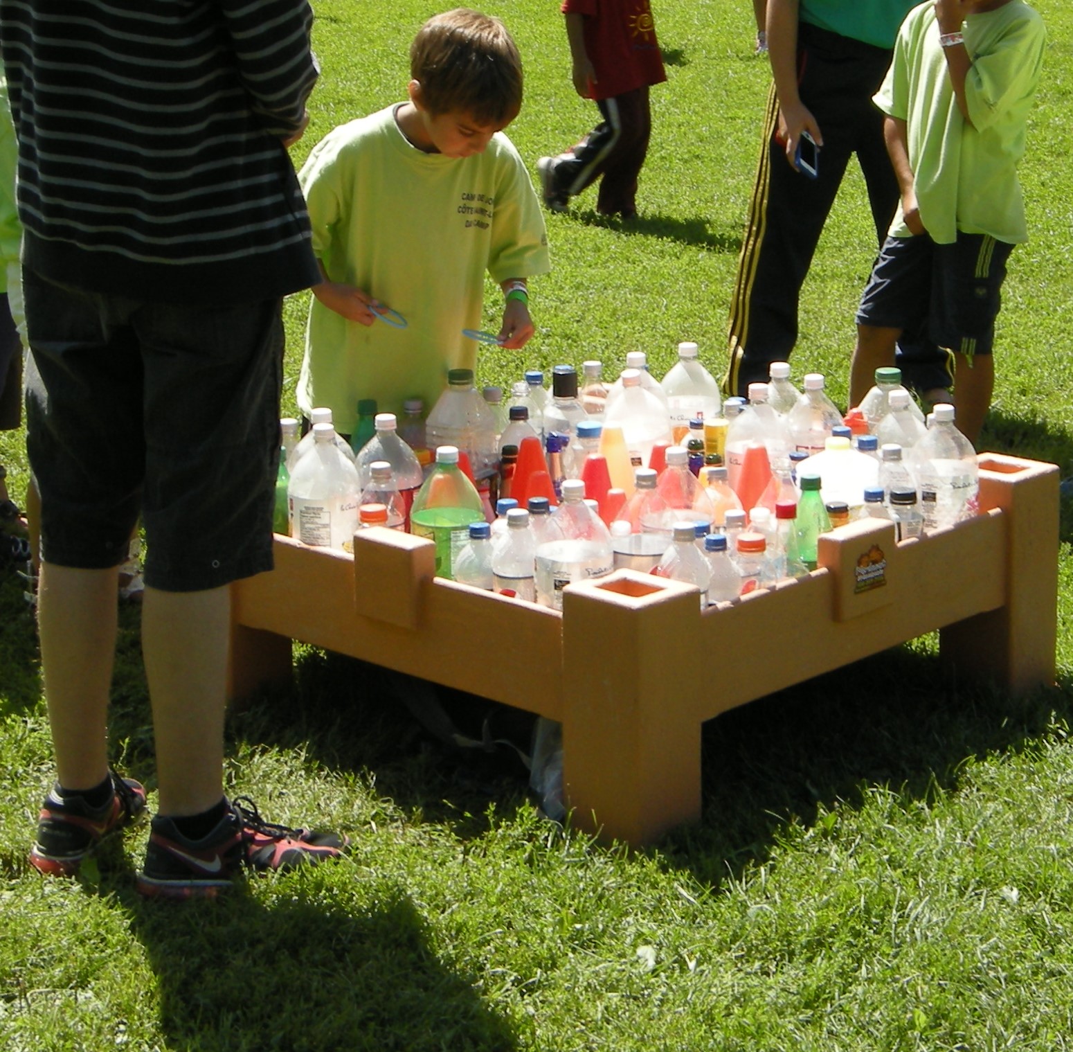 - Lancez les petits cerceaux afin qu’ils restent accrochés sur une bouteille